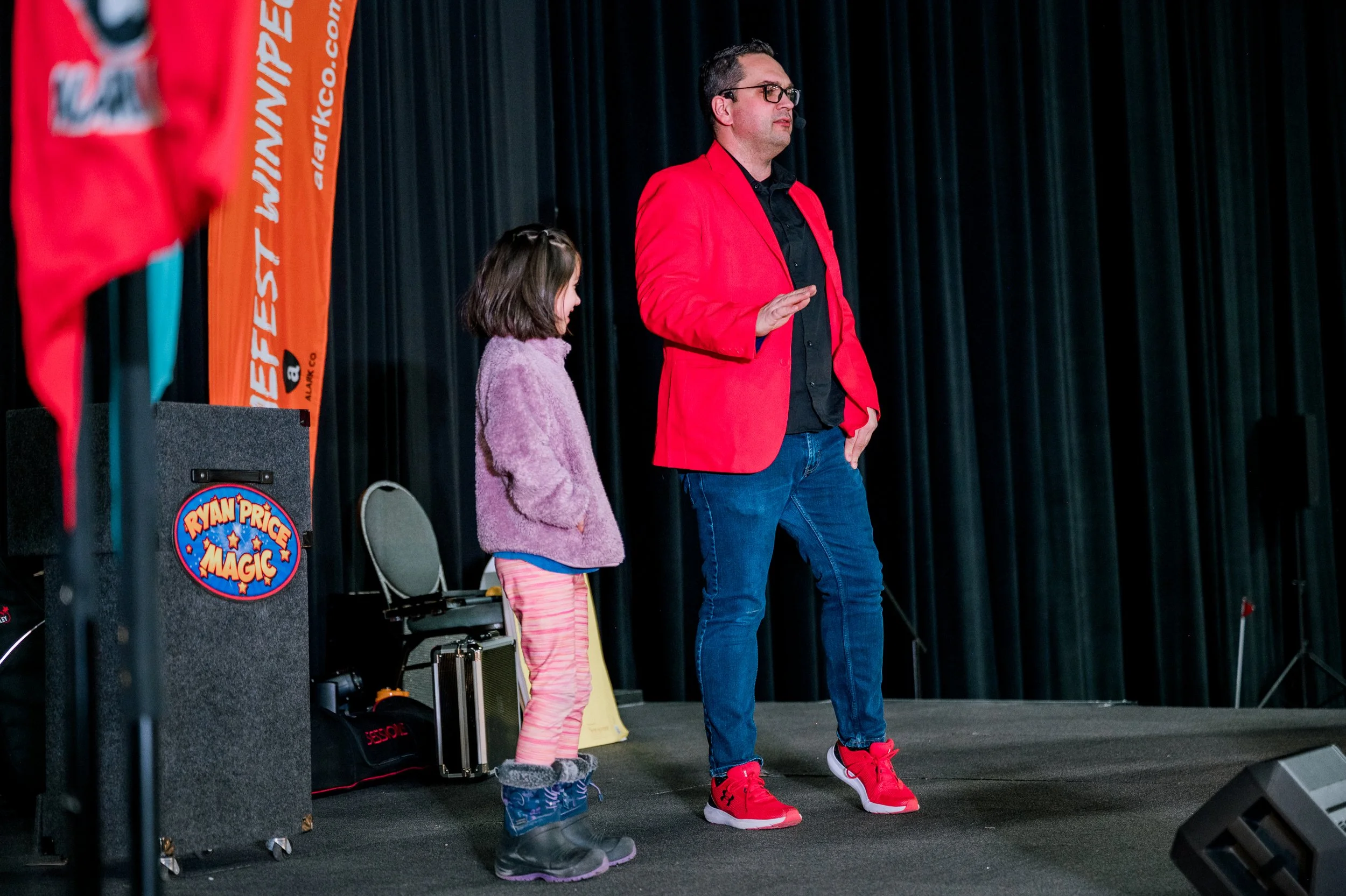 A man and a young girl standing on a stage with a black curtain backdrop. The man is wearing a red blazer, black shirt, jeans, and red sneakers, and appears to be performing a magic trick or speaking. The girl is wearing a pink fuzzy jacket, striped